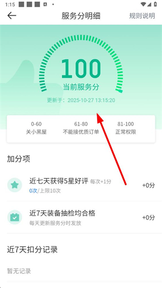 4、在服务分明细页面可查看当前服务分、加分项和扣分记录等信息。