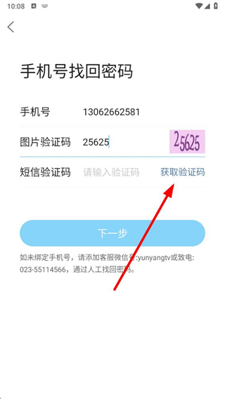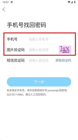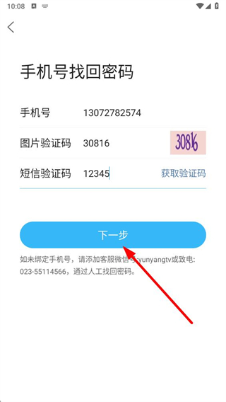 4、在手机号找回密码页面点击下一步按钮,按提示完成密码找回操作即可。