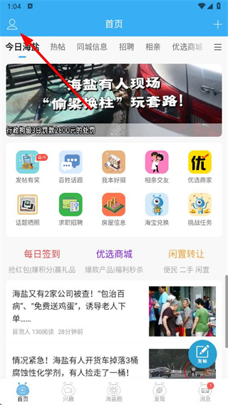 1、在海盐网app首页点击左上角个人图标,进入我的页面。
