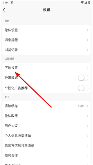 3、在设置页面点击字体设置选项,进入字体设置页面。