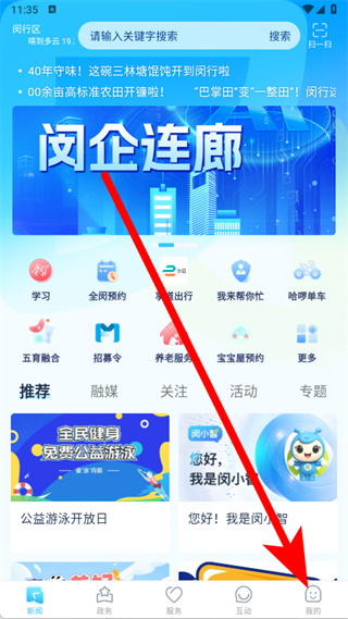 1、打开今日闵行新闻,点击底部导航栏的我的,进入个人中心页面。