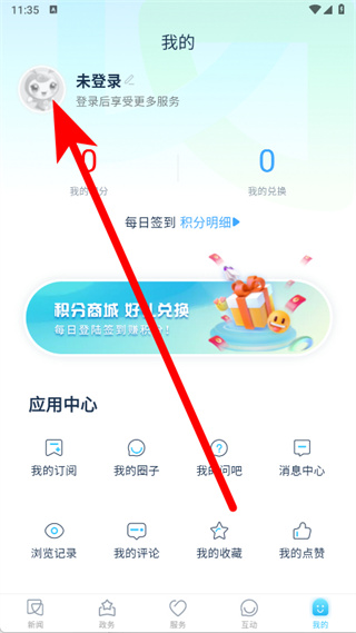 2、在个人中心页面,点击未登录区域的头像,进入登录界面。