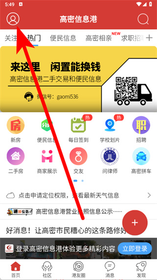 1、打开高密信息港,点击首页左上角的头像,进入我的页面。