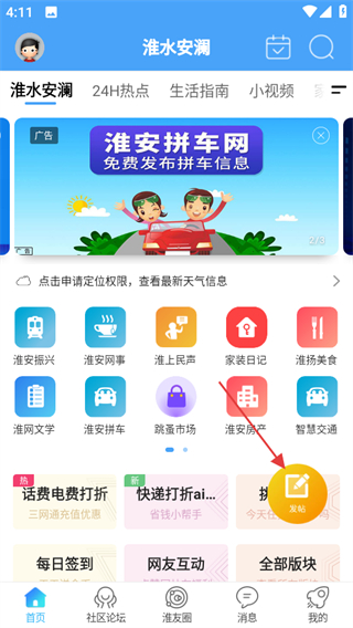 1、打开淮水安澜,点击黄色按钮的发帖,可进入帖子版块选择页面。
