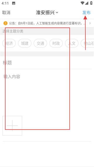 3、在发帖页面,选择主题分类填写标题和内容后点击发布可完成帖子发布。