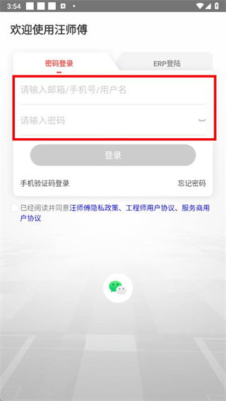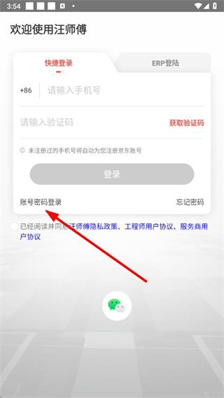1、在汪师傅app登录页面点击账号密码登录选项,进入密码登录页面。