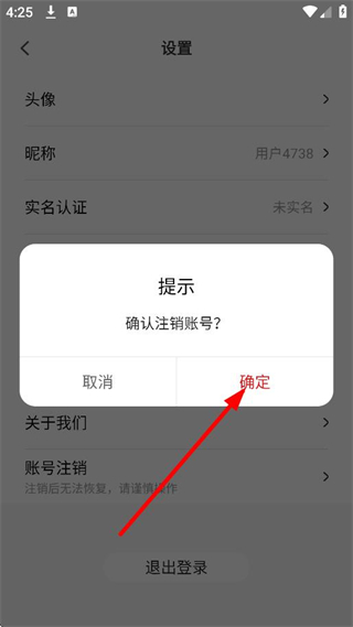 4、在确认注销提示框中,点击确定,完成账号注销操作。