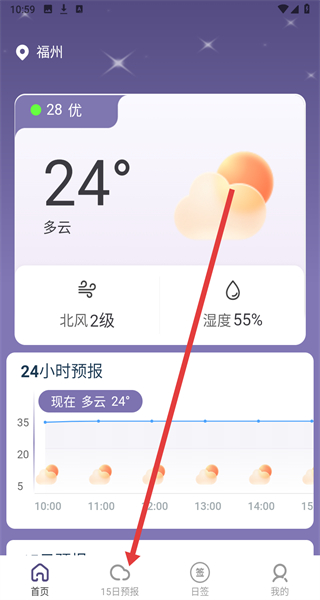 3、在福州天气页面点击底部“15日预报”,进入15日预报界面。