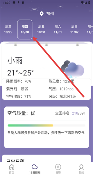 4、在15日预报界面点击“周四10/30”,查看福州市10月30日的详细天气信息,包括温度、天气状况、降雨概率等。