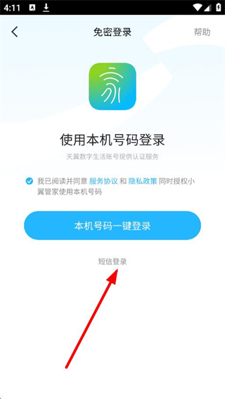2、在登录方式选择页面,点击短信登录,进入短信登录页面。