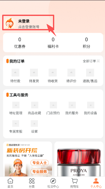 2、在个人中心页面,点击点击登录账号选项,进入注册登录页面。