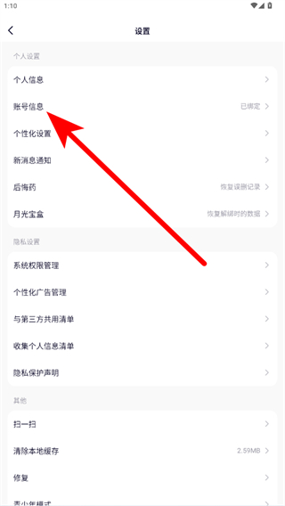 3、进入设置页面后,下滑找到账号信息选项并点击。