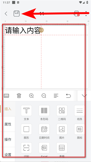 4、输入内容,可通过下方功能栏插入文本、条形码等元素,编辑完成后,点击左上角保存。