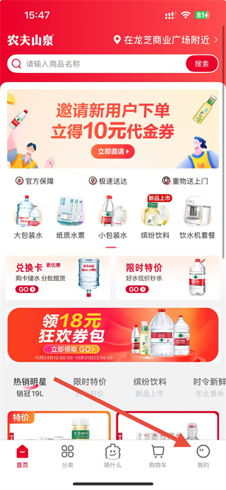 送水到府里头提供了农夫山泉水产品的订购,用户下单后即可享受送水到家,送水到府定期会做相关的活动,例如买赠活动以及送券活动,优惠券直接在送水到府内使用,可以当现金抵扣。