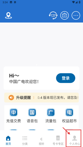 1、打开中国广电APP首页,点击底部个人中心选项,进入我的页面。