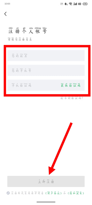 4、填写收到的手机验证码,勾选同意相关用户协议,点击立即注册按钮,完成账号注册。