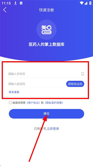 4、在快速注册页面,输入手机与验证码,点击确定,完成账号注册操作。
