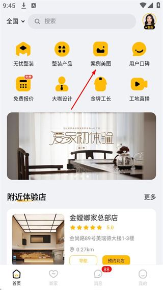 1、打开金螳螂家,在首页点击案例美图,可进入整装案例页面。