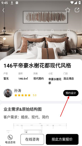 3、在案例详情页面,点击预约设计可进入预约设计页面。