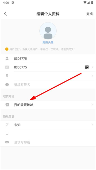 2、在编辑个人资料页面中,点击我的收货地址选项。