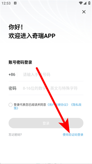 2、在登录页面,点击使用验证码登录,进入验证码登录页面。