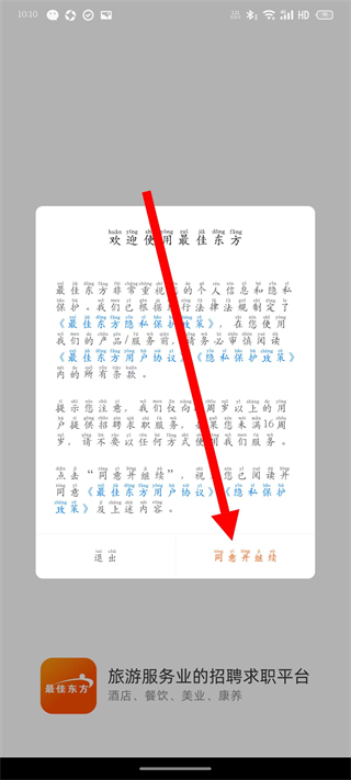 1、打开最佳东方,在用户协议弹窗,点击同意并继续。
