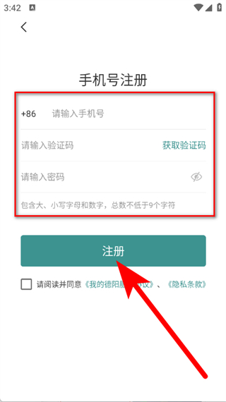 4、填写手机号码,点击获取验证码,输入验证码后设置密码,点击注册,完成账号注册。