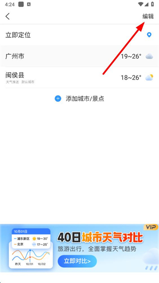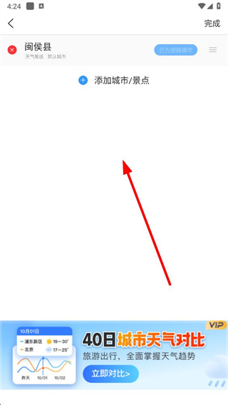 3、在添加城市页面,可通过点击添加定位城市快速添加当前定位城市,也可以在搜索框内输入区县、街道或景点等关键词进行搜索。
