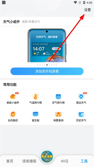 1、在15日天气预报app界面点击工具选项,进入工具页面。
