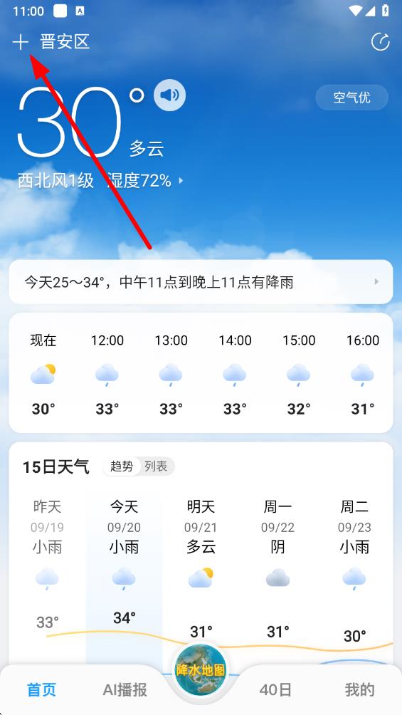 1、打开15日天气预报APP,点击左上角加号进入城市管理页面。