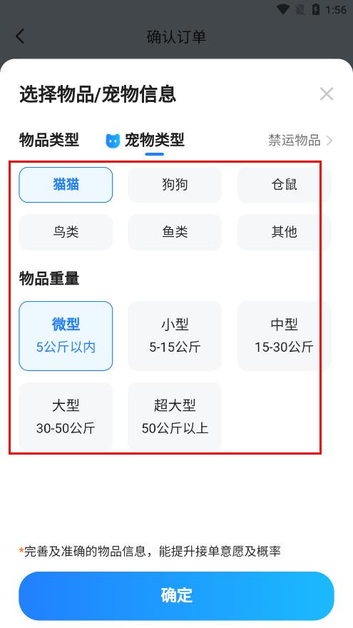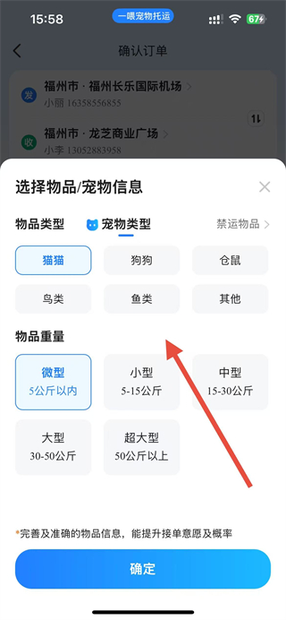 3、弹出选择宠物类型和物品重量等信息,选择后点击确定。
