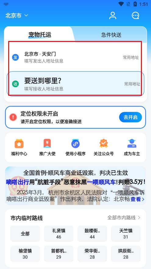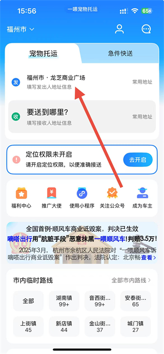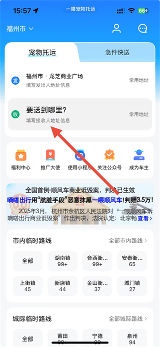 1、打开一喂宠物托运应用,在首页发栏填写出发地址,在收栏填写接收地址。