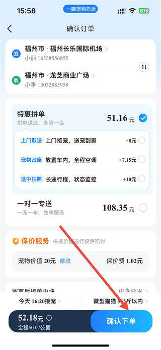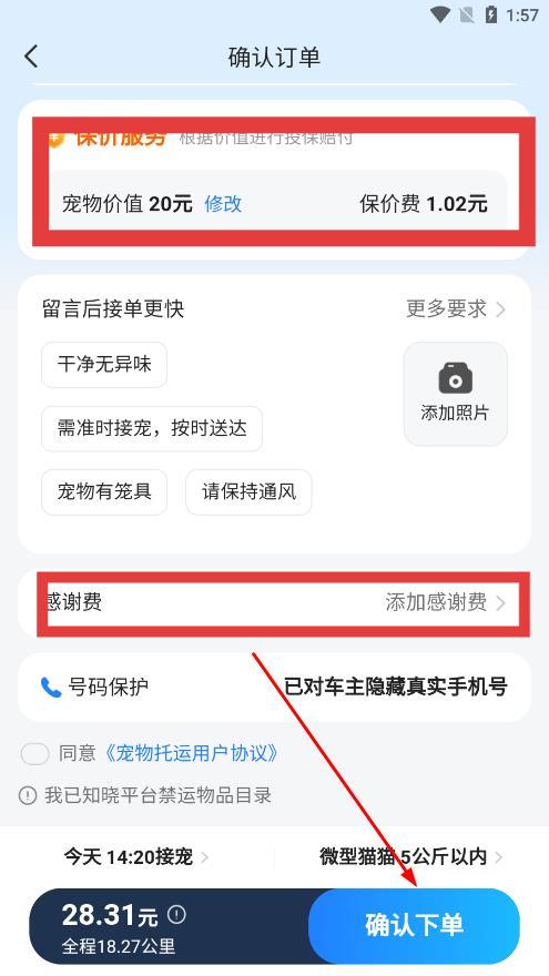 4、可以选择保价服务,根据填写的宠物价值收取保价费,也可添加感谢费,点击确认下单,即可看到最终的收费金额。