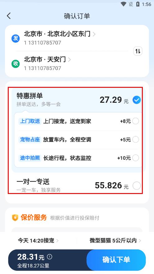 3、在确认订单页面,有多种增值服务可供选择,每项服务对应不同的加价,还有特惠拼单和一对一专送的不同收费模式。