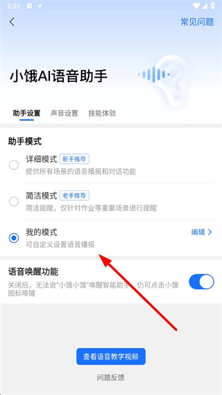 5、进入后可设置小饿AI语音助手的模式等语音播报相关内容。