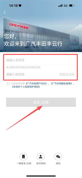 4、输入手机号,获取验证码并输入后,点击登录/注册,完成账号登录或注册操作。