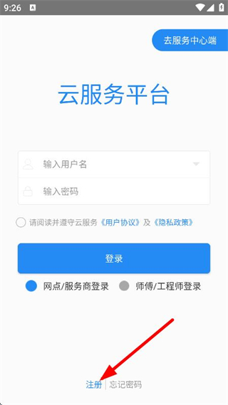 2、在云服务平台登录页面,点击注册,进入注册页面。