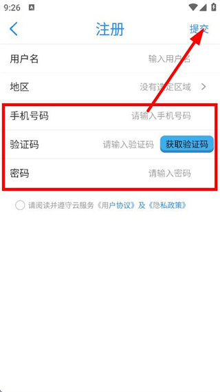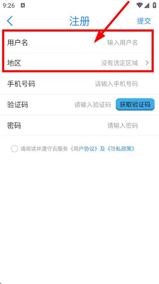 3、随后在注册页面,输入用户名、选择地区、手机号码。