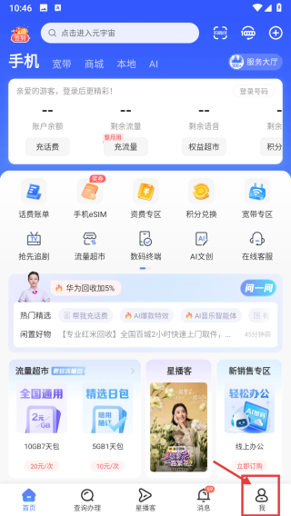 1、打开电信服务类APP首页,点击底部我选项,进入个人中心页面。
