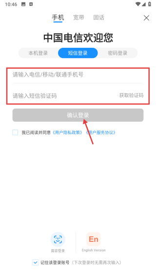 4、在短信登录页面,填写手机号、获取并输入短信验证码,勾选同意用户服务协议后,点击确认登录按钮,完成账号登录操作。