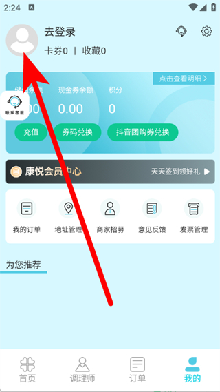 1、打开康悦到家,点击底部导航栏我的,进入个人中心。