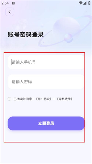 4、在账号密码登录页面,输入信息,同意协议后点击立即登录,完成账号登录。