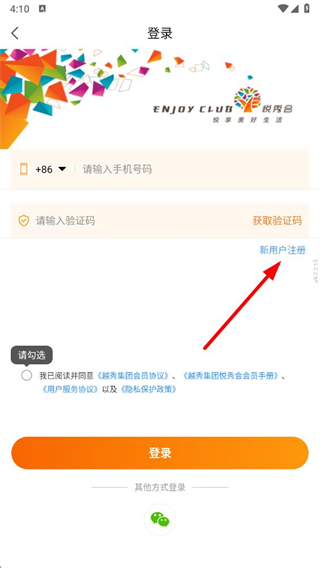 3、进入登录页面后,点击新用户注册选项,进入注册页面。