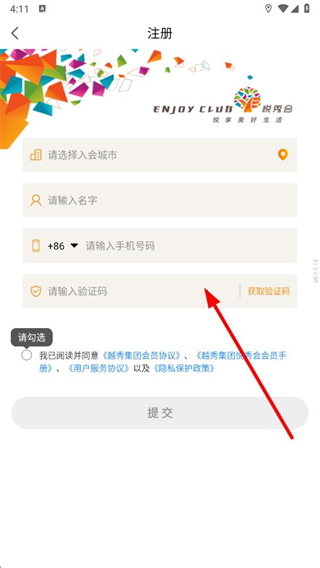 4、选择入会城市,填写个人信息获取验证码,勾选相关协议后,点击提交按钮即可完成账号注册操作。