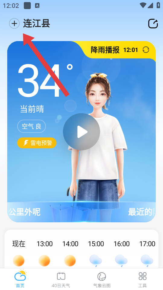 1、在开心天气主界面,点击左上角的+号按钮,进入城市管理页面。