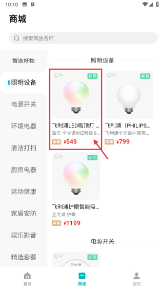2、在商城页面,点击照明设备分类,进入照明设备列表页面。