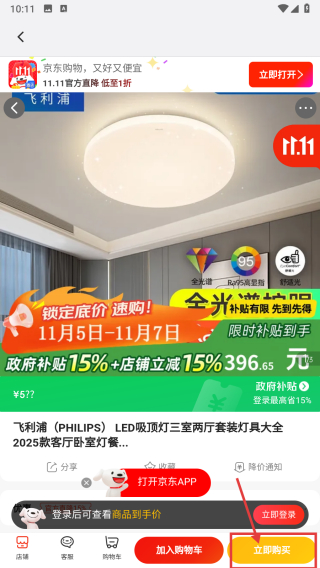 4、在商品详情页面,点击立即购买按钮,即可发起该照明设备的购买操作。