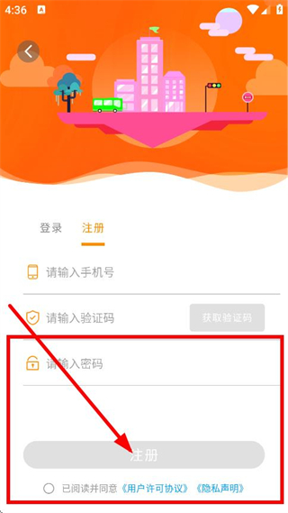4、输入密码,同意相关协议后,点击注册,完成账号注册操作。