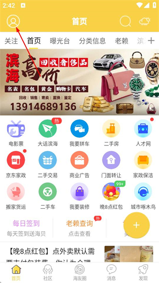 1、在滨海论坛首页,点击左上角个人图标,进入个人页面。