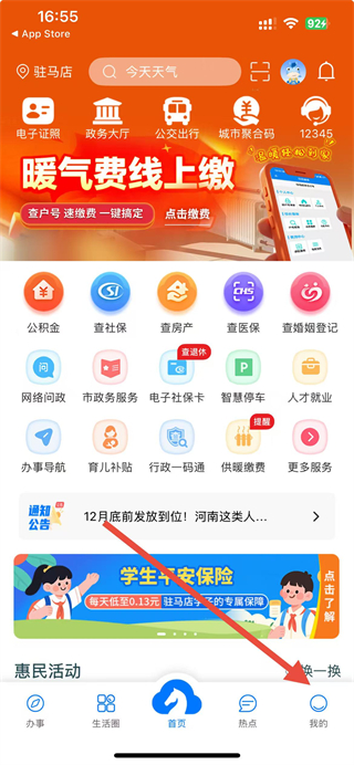 1、打开咱的驻马店app,在首页点击右下角我的选项,进入个人页面。